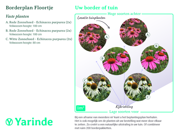 Zu jedem Yarinde-Bordürenpaket finden Sie einen Pflanzplan. Sie können diese zum Pflanzen Ihrer neuen Gartenpflanzen verwenden. Klicken Sie auf „Weitere Fotos“ oder auf das Titelbild des Randpakets, um die vergrößerte Version des Pflanzplans herunterzuladen. Pflanzen Sie die höheren Sorten im hinteren Teil Ihres Gartens und die niedrigeren Sorten im vorderen Bereich. Wenn Sie mehrere m2 eines Randpakets bestellen, können Sie den Pflanzplan wiederholen (nebeneinander) oder jeden Kreis im Pflanzplan als mehrere Gartenpflanzen betrachten.