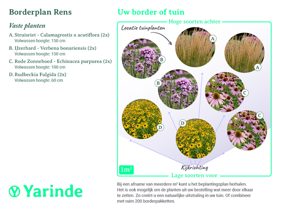 Das Beetpaket Rens besteht aus 4 verschiedenen Gartenpflanzen, die perfekt zusammenpassen, 3 Stauden und 1 Ziergras. Alle Gartenpflanzen in diesem Rens-Paket sind grundlegende Gartenpflanzen für Menschen, die einen Präriegarten oder eine Präriegarten anlegen möchten. Für jeden m2, den Sie bestellen, erhalten Sie 8 Gartenpflanzen. Mit diesem m2-Gartenpaket haben Sie immer ein wunderschönes volles Beet. Bestellen Sie mehrere Exemplare oder kombinieren Sie sie mit einem anderen Randpaket. Entdecken Sie unser Beetpaket – Prairie Gardens oder sehen Sie sich alle Staudenpakete von Yarinde an.