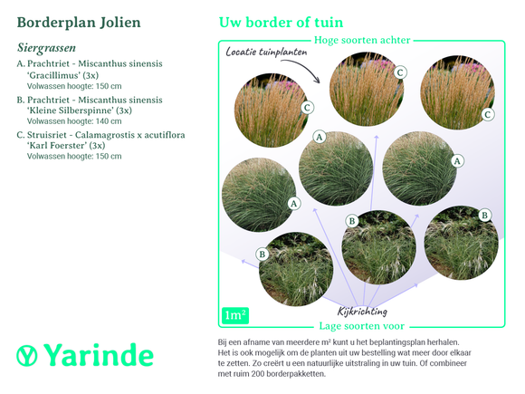 Die pflegeleichten Gartenpflanzen in diesem m2-Paket werden alle über 1 Meter hoch. Sehr schön als Hecke oder zum Pflanzen zwischen Stauden und Sträuchern. Mit diesen Ziergräsern können Sie natürliche Effekte in Ihrem Garten erzielen. Dieses Gartenbeet-Pflanzenpaket kann auch problemlos pro m2 bestellt werden. Also sehr praktisch. Schön in Kombination mit den anderen Bordürenpaketen von Yarinde.nl, wie zum Beispiel Sets mit lila oder rosa Pumphose.