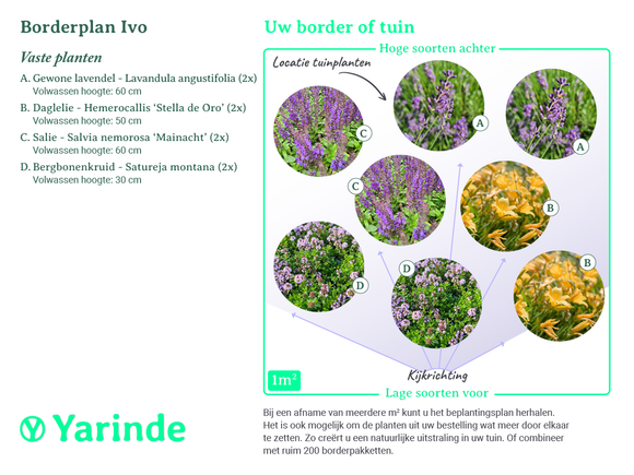 Jedes Yarinde-Beetpaket enthält einen Pflanzplan. Diesen können Sie zum Anpflanzen Ihrer neuen Gartenpflanzen verwenden. Klicken Sie auf „mehr Fotos“ oder auf das Titelbild des Beetpakets, um eine vergrößerte Version des Pflanzplans herunterzuladen. Pflanzen Sie die höheren Sorten hinten im Garten und die niedrigeren Sorten weiter vorne. Wenn Sie mehrere Quadratmeter eines Beetpakets bestellen, können Sie den Pflanzplan wiederholen (nebeneinander) oder jeden Kreis im Pflanzplan als mehrere Gartenpflanzen betrachten.