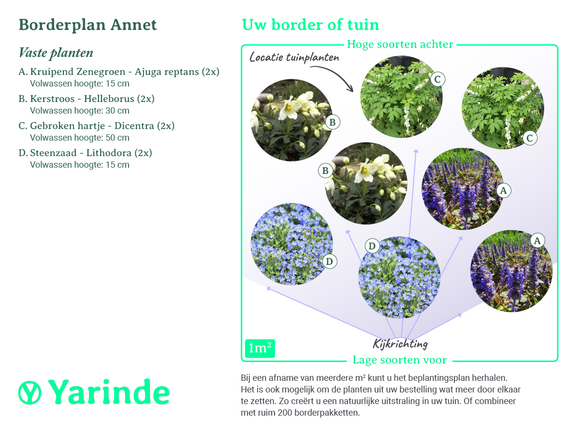Entdecken Sie auf dieser Seite das Bordürenpaket von Annet. Dieses teilweise heimische Rabattenpaket besteht aus 4 verschiedenen Stauden, die alle früh im Frühjahr blühen. Sie erhalten 8 Stauden pro m² , den Sie bestellen. Genug für einen schönen, vollen Garten. Alle Gartenpflanzen blühen in Blau oder Weiß. Zu jedem Beetpaket finden Sie den Pflanzplan , nützliche Pflanzanleitungen und unsere kostenlose App zur Gartenpflege. Yarinde ist die Webadresse für den Kauf von Staudenpflanzen.