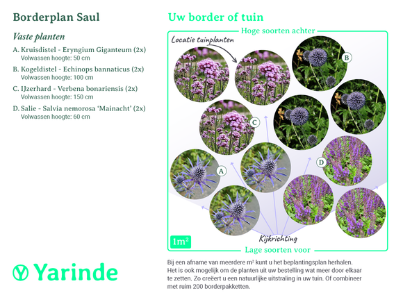 Zu jedem Yarinde-Bordürenpaket finden Sie einen Pflanzplan. Sie können diese zum Pflanzen Ihrer neuen Gartenpflanzen verwenden. Klicken Sie auf „Weitere Fotos“ oder auf das Titelbild des Randpakets, um die vergrößerte Version des Pflanzplans herunterzuladen. Pflanzen Sie die höheren Sorten im hinteren Teil Ihres Gartens und die niedrigeren Sorten im vorderen Bereich. Wenn Sie mehrere m2 eines Randpakets bestellen, können Sie den Pflanzplan wiederholen (nebeneinander) oder jeden Kreis im Pflanzplan als mehrere Gartenpflanzen betrachten.