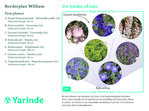Das Beetpaket William besteht aus farbenfrohen und duftenden Gartenpflanzen. Mit diesem Beetpaket schaffen Sie eine gemütliche und romantische Atmosphäre. Die verschiedenen Gartenpflanzen aus diesem Beetpaket blühen in den Farben Weiß, Rosa und Lila. Alle Sorten haben unterschiedliche Blütenformen, sodass Sie mit diesem Beetpaket viel Abwechslung in Ihrem Garten oder Beet haben. Sie können dieses Beetpaket ab 1 m² bestellen. Beim Kauf von 2 m² oder mehr erhalten Sie die Gartenpflanzen im Verhältnis 1, also immer genug, um Ihren Garten oder Ihr Beet zu bepflanzen. Wenn Sie 5 m² kaufen, platzieren Sie die Pflanzen in Gruppen von 5 Stück. Für sehr große Beete empfehlen wir, die Gruppen zu wiederholen.