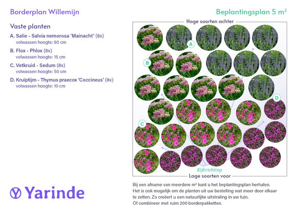 Das Beetpaket Willemijn lässt sich gut mit dem Zierapfel-Halbstamm Malus kombinieren, der eine Gesamthöhe von ca. 165 cm erreicht. Oder kombinieren Sie ihn bei etwas mehr Platz mit einem mehrstämmigen Strauch . Pflanzen Sie die Stauden (Fetthenne und Salbei) und die Bodendecker (Phlox und Thymus) darum herum. Jedem Beetpaket von Yarinde liegt ein Pflanzplan bei, zusätzlich erhalten Sie von uns eine Pflanzanleitung .