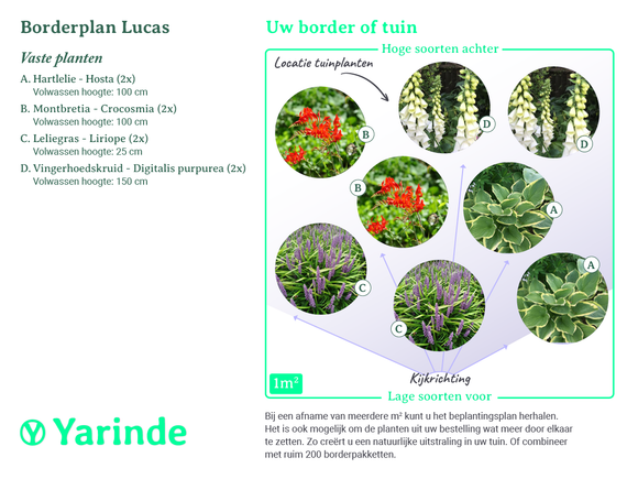 Das Beetpaket Lucas besteht aus Gartenpflanzen, die mehrere Monate lang blühen. Die ersten Gartenpflanzen, die blühen, sind Funkien und Fingerhut. Diese blühen in den Monaten Juni und Juli. Die Montbretia folgt mit roten Blüten im Juli und August. Schließlich folgt das Liliengras, das von August bis Oktober blüht. Mit dem Lucas-Bordürenpaket haben Sie Blumen in den Monaten: Juni – Juli – August – September – Oktober. Für Frühblüher empfehlen wir einen m2 Nieswurz 'Helleborus' und einen m2 Immergrün 'Vinca' .