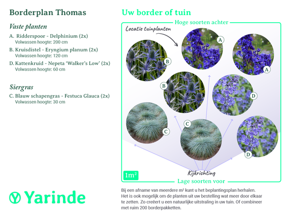 Das Beetpaket Thomas besteht aus blau blühenden Stauden, die sich für einen Standort im Halbschatten eignen. Alle Stauden aus dem Thomas-Beetpaket locken Bienen, Hummeln, Schmetterlinge und andere Insekten an. Sie erhalten 8 Stauden pro m2 , genug für einen schönen, vollen Garten. Die Gartenpflanzen variieren in Blütenform und Wuchshöhe. Zusätzlich zu 6 blühenden Stauden erhalten Sie 2 blaue Ziergräser, das Blaue Schafgras. Das Thomas-Paket besteht aus einfachen Gartenpflanzen, die auch für Menschen ohne grünen Daumen geeignet sind. Zu jedem Beetpaket von Yarinde finden Sie einen Pflanzplan (Pflanzplan) und Sie erhalten eine Pflanzanleitung .